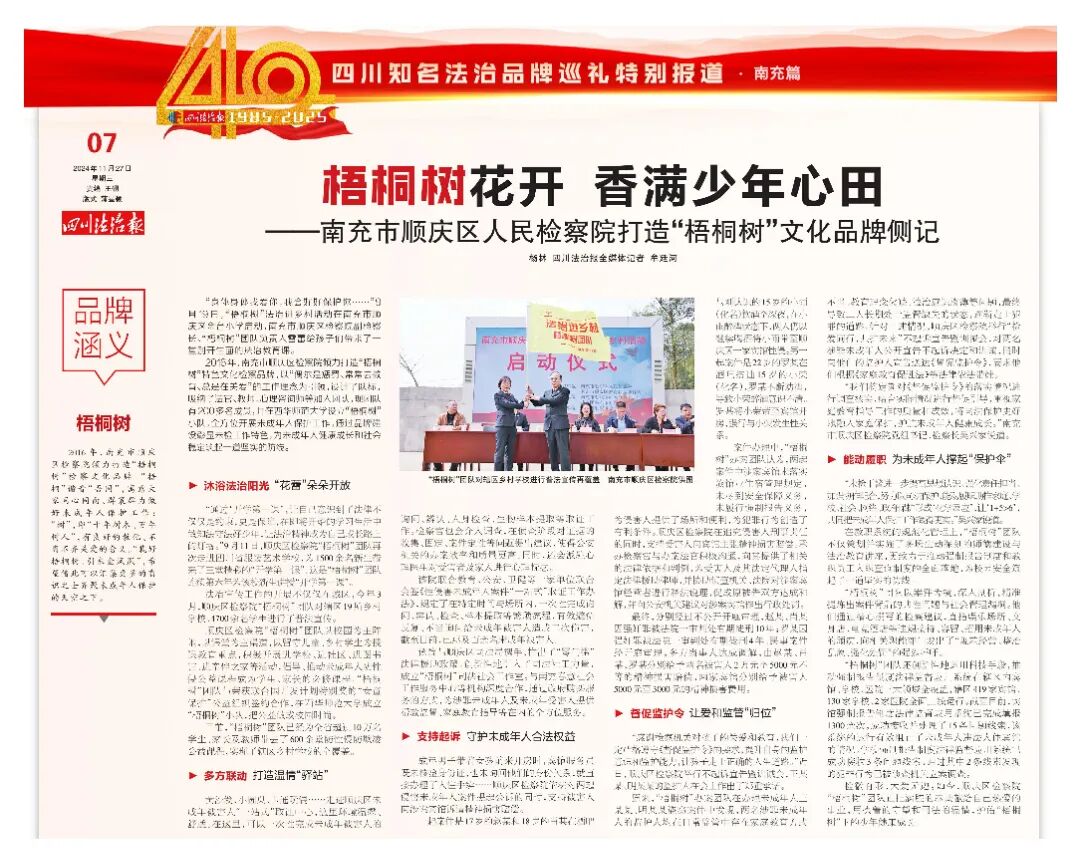 2016年,南充市顺庆区检察院倾力打造“梧桐树”特色文化检察品牌,以“偶尔是惩罚、常常去教育、总是在关爱”的工作理念为引领,设计了队标,吸纳了法官、教师、心理咨询师等加入团队,现团队有200多名成员,并在西华师范大学设立“梧桐树”小队,全方位开展未成年人保护工作,通过品牌建设彰显未检工作特色,为未成年人健康成长和社会稳定筑起一道坚实的防线。