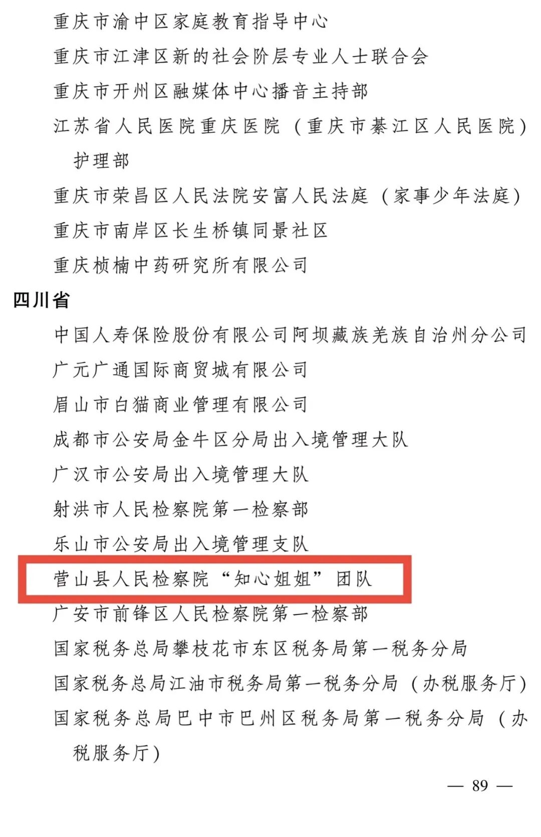 为表彰先进、树立榜样, 充分发挥先进典型和模范人物示范作用,近日,全国妇联公布全国三八红旗手标兵、全国三八红旗手、全国三八红旗集体、全国巾帼文明岗名单。其中,营山县人民检察院“知心姐姐”团队荣获全国巾帼文明岗。