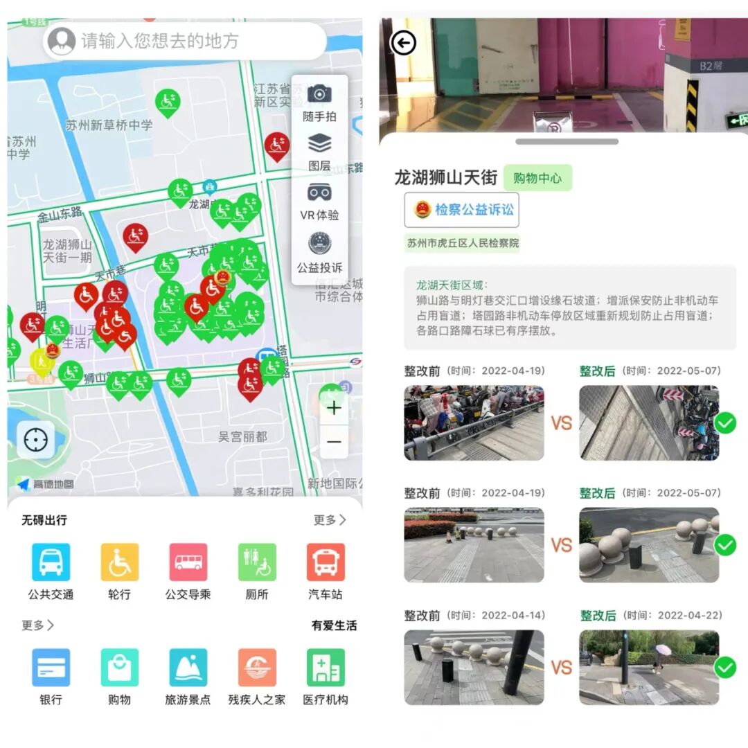 办案过程中,虎丘区院将检察履职融入苏州市无障碍地图App开发建设,在地图中嵌入“公益投诉”模块,方便群众及时向检察机关反映线索;点击地图上的检徽可随时查看评估无障碍设施整改情况,实现地图大数据与检察大数据的双向互联。目前,虎丘区院通过“益心为公”志愿者和无障碍地图App已受理线索10余件,立案8件,推动改造辖区地铁站无障碍通道23处,规范商业、文化、医疗康复等公共建筑内无障碍电梯、无障碍洗手间、无障碍车位数十处。