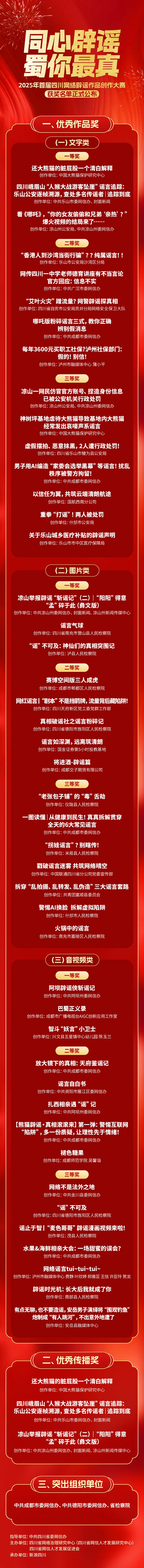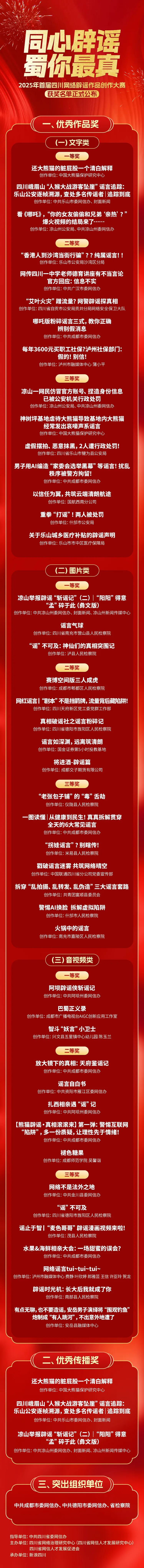 为深入推进网络空间治理,营造更加清朗的网络环境,由中共四川省委网信办指导的“同心辟谣 蜀你最真——2025年首届四川网络辟谣作品创作大赛”于今年7月正式启动。本次大赛以“同心辟谣 蜀你最真”为主题,面向全社会征集优秀辟谣作品,通过激发全民参与热情,以真相粉碎谣言,用共治破除谣言。经过四个月的作品征集与专家评审,最终从240件参赛作品中评选出45件优秀辟谣作品、3个优秀传播奖和3个突出组织单位奖。