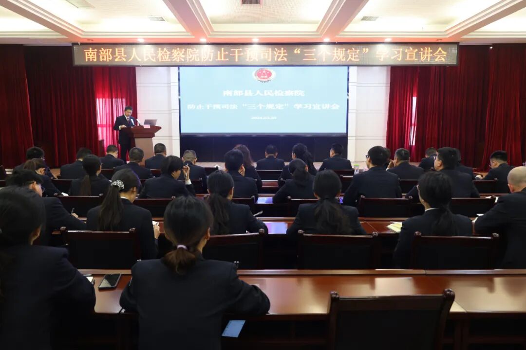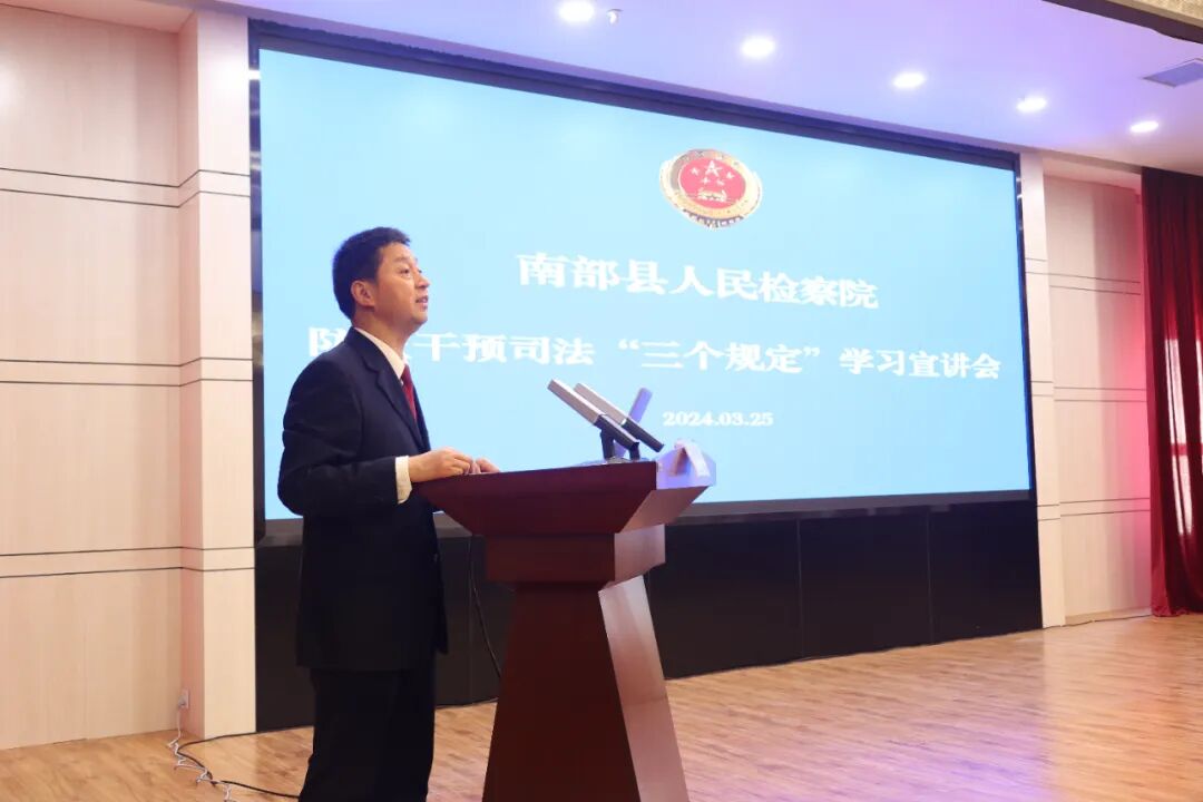 3月25日下午,南部县检察院召开防止干预司法“三个规定”学习宣讲会,在家班子成员、全院干警参加了集中学习活动。院党组副书记、常务副检察长王君主持会议,院党组书记、检察长李晓冬出席会议并讲话。