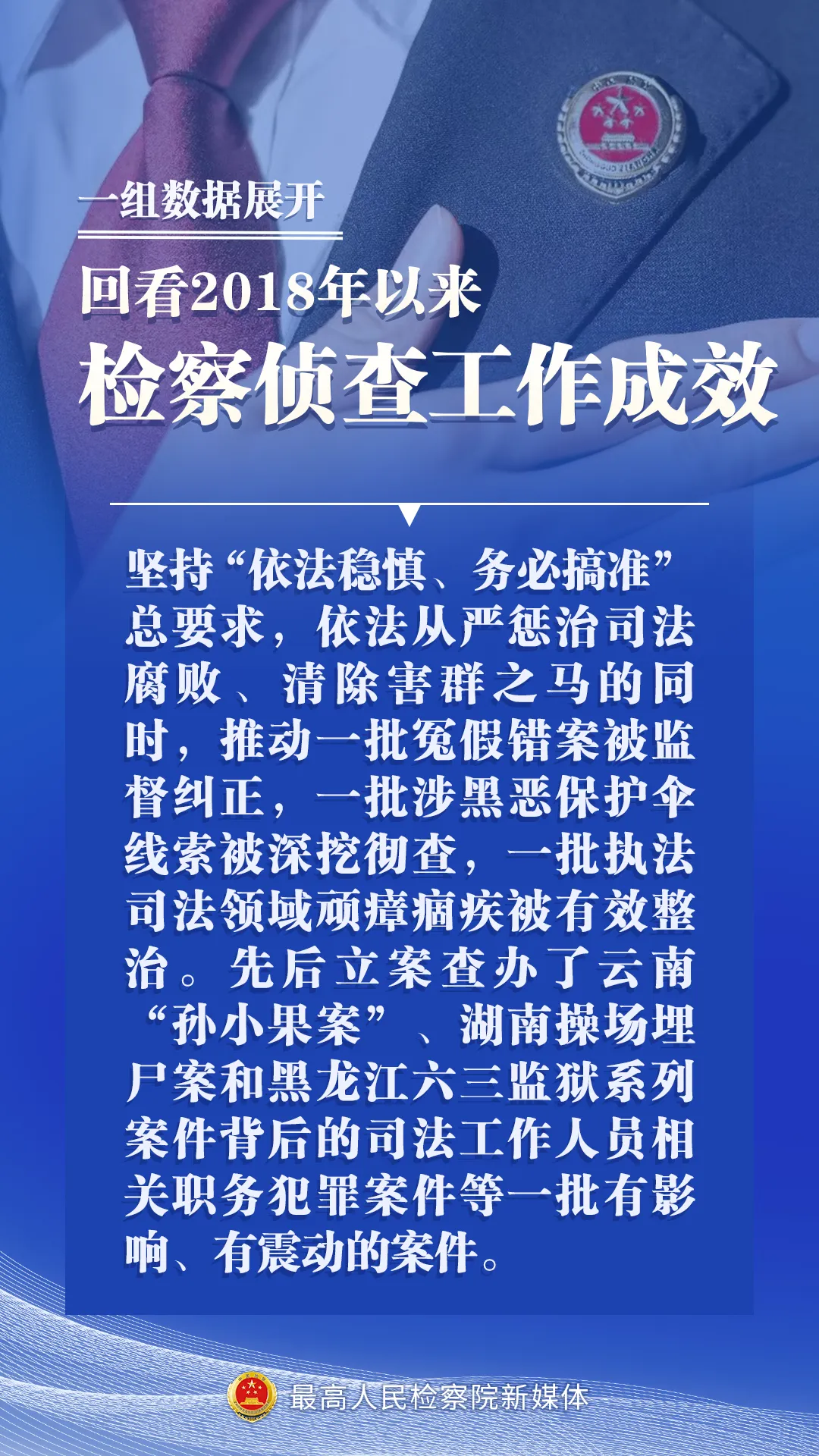 2018年以来,检察机关先后立案查办了云南“孙小果案”、湖南操场埋尸案和黑龙江六三监狱系列案件背后的司法工作人员相关职务犯罪案件等一批有影响、有震动的案件。