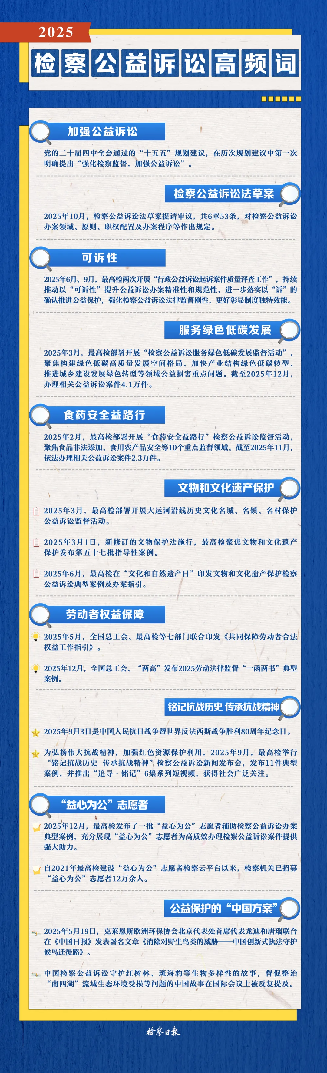 编者按 民有所呼,我有所应。2025年,是推动检察公益诉讼法立法进程的关键一年,各地检察机关结合人大代表、政协委员和专家学者等的意见建议,聚焦中国式现代化进程中的公益保护难题,形成了以国家为主导、以人民为中心的公益保护新范式。《检察日报·公益周刊》特别梳理2025年检察公益诉讼生动实践,报道检察机关推动加强热敏纸劳动安全防护行政公益诉讼案等典型案例,并讲述全国人大代表巴莫曲布嫫过去一年助力检察公益诉讼工作的履职故事。