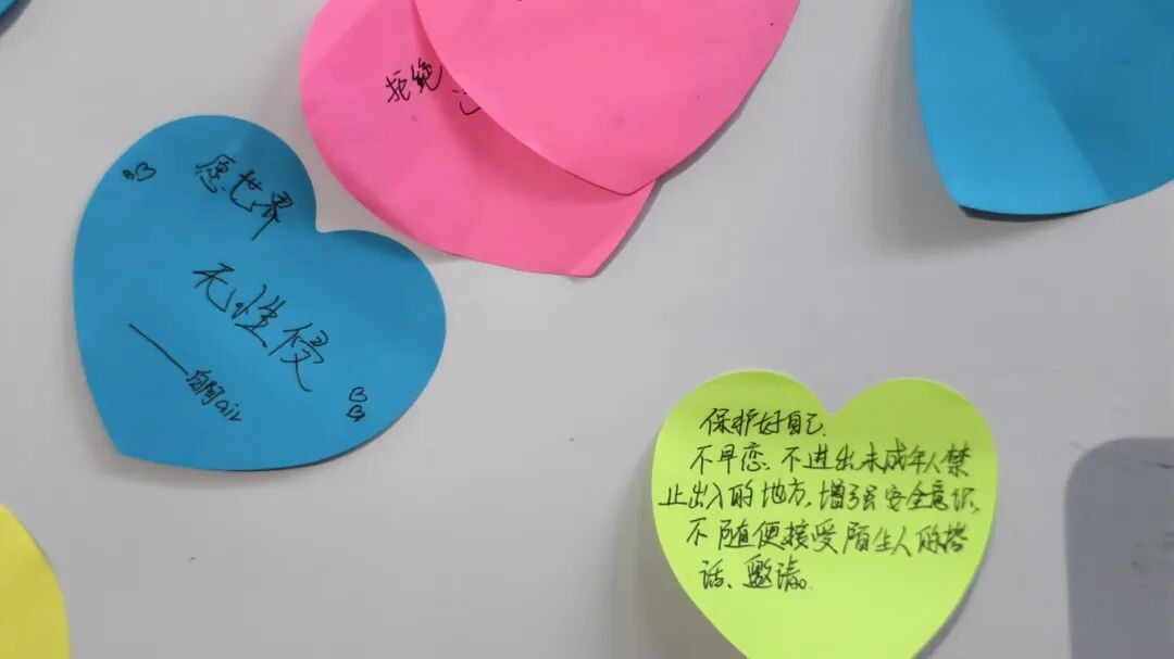 活动的尾声,学生代表发出倡议“我是青春守护者,拒绝侵害,勇敢说不!”同学们在志愿者引导下,在留言墙上贴上写满感想与承诺的便签,许下“学会自我保护,尊重他人界限”的承诺。