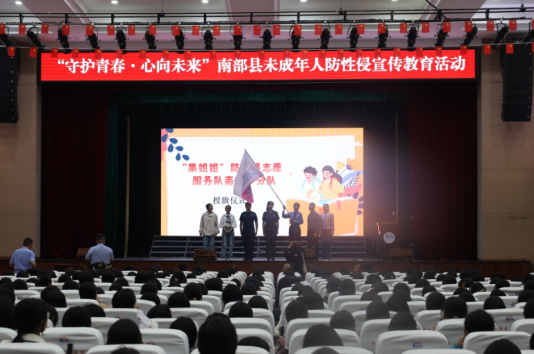 随后的防性侵宣传队伍授旗仪式上,县人大常委会副主任刘坚指出,未成年人保护是社会共同责任,各方要凝聚合力,共同筑牢未成年人保护屏障。县妇联主席何逦与县委政法委常务副书记何彬共同为“果姐姐”防性侵志愿服务南部小分队授旗。