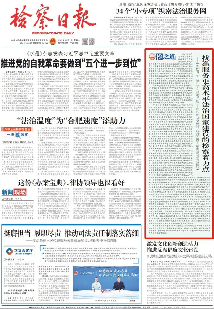 近日,习近平总书记对全面依法治国工作作出重要指示,对建设更加完善的中国特色社会主义法治体系、建设更高水平的社会主义法治国家提出明确要求。党的二十届四中全会审议通过的《中共中央关于制定国民经济和社会发展第十五个五年规划的建议》(下称《建议》),擘画了推进中国式现代化的宏伟蓝图,其中专门部署“推进社会主义民主法治建设”。中央全面依法治国工作会议强调,“为确保基本实现社会主义现代化取得决定性进展提供坚实法治保障”。所有这些,都为检察机关坚持全面依法治国、加强法律监督工作指明了前进方向。