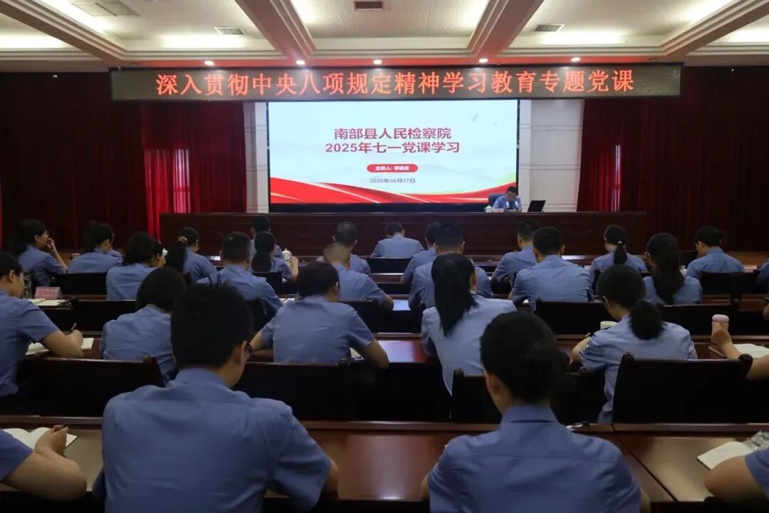 七一建党节来临之际,南部县人民检察院召开深入贯彻中央八项规定精神学习教育专题党课,党组书记、检察长李晓冬以“当好四个角色 锻造忠诚担当廉洁为民的检察铁军”为题,为全体干警上了一堂深刻的“思想课”“纪律课”“责任课”。
