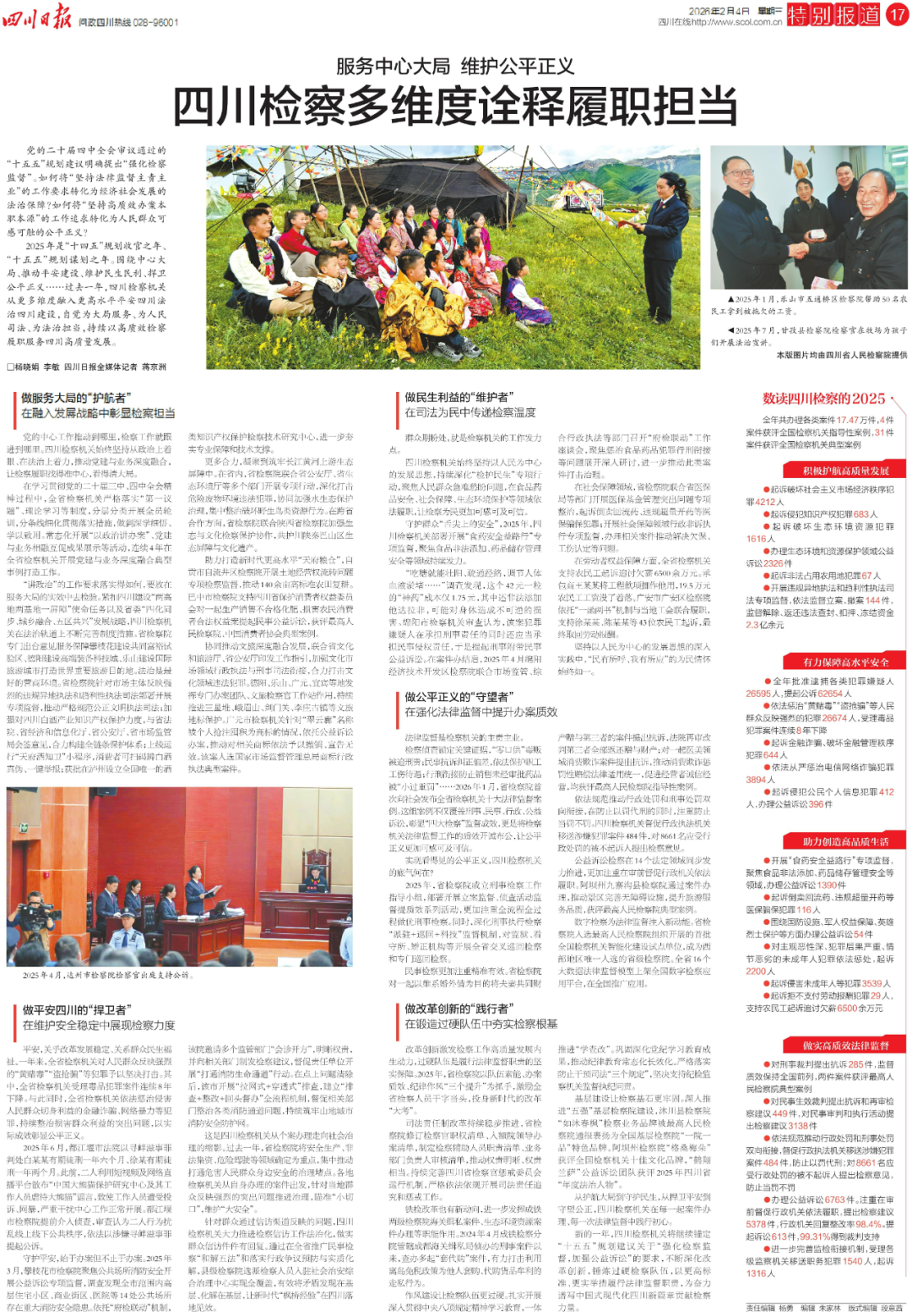 2025年是“十四五”规划收官之年、“十五五”规划谋划之年。围绕中心大局、推动平安建设、维护民生民利、捍卫公平正义……过去一年,四川检察机关从更多维度融入更高水平平安四川法治四川建设,自觉为大局服务、为人民司法、为法治担当,持续以高质效检察履职服务四川高质量发展。