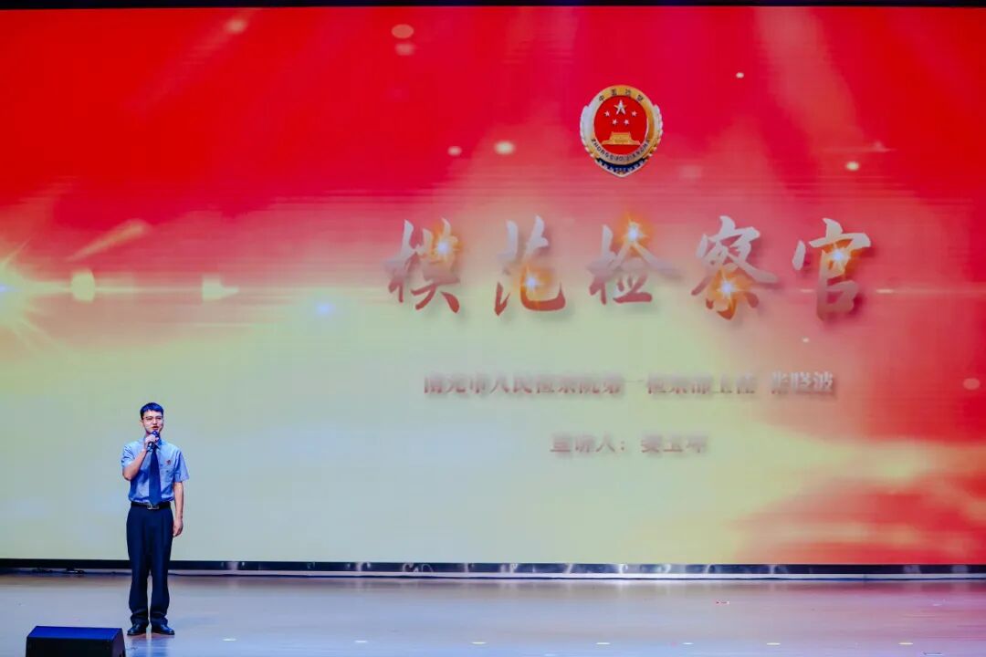 跨越时空的同台,初心与使命交相辉映。舞台上,星光璀璨:陈菊芳、吴鉴、王岚、唐蔚、张晓波、潘丽琼、薛小玉、刘运镁等8位获得省部级以上表彰奖励的英模代表齐聚一台。他们或已白发苍苍,或仍风华正茂,都在平凡的岗位践行着人民检察官的铮铮誓言。