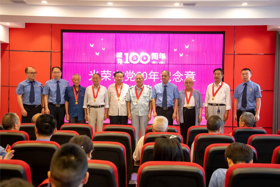 在随后进行的“光荣在党50周年纪念章颁发仪式”上,老党员们从领导们手中接过沉甸甸纪念章,激动万分,纷纷表示在建党100周年之际得到这枚纪念章更是鼓励他们要继续坚定理想信念,牢记初心使命,珍惜光荣历史,永葆政治本色,努力书写共产党员新的荣光。