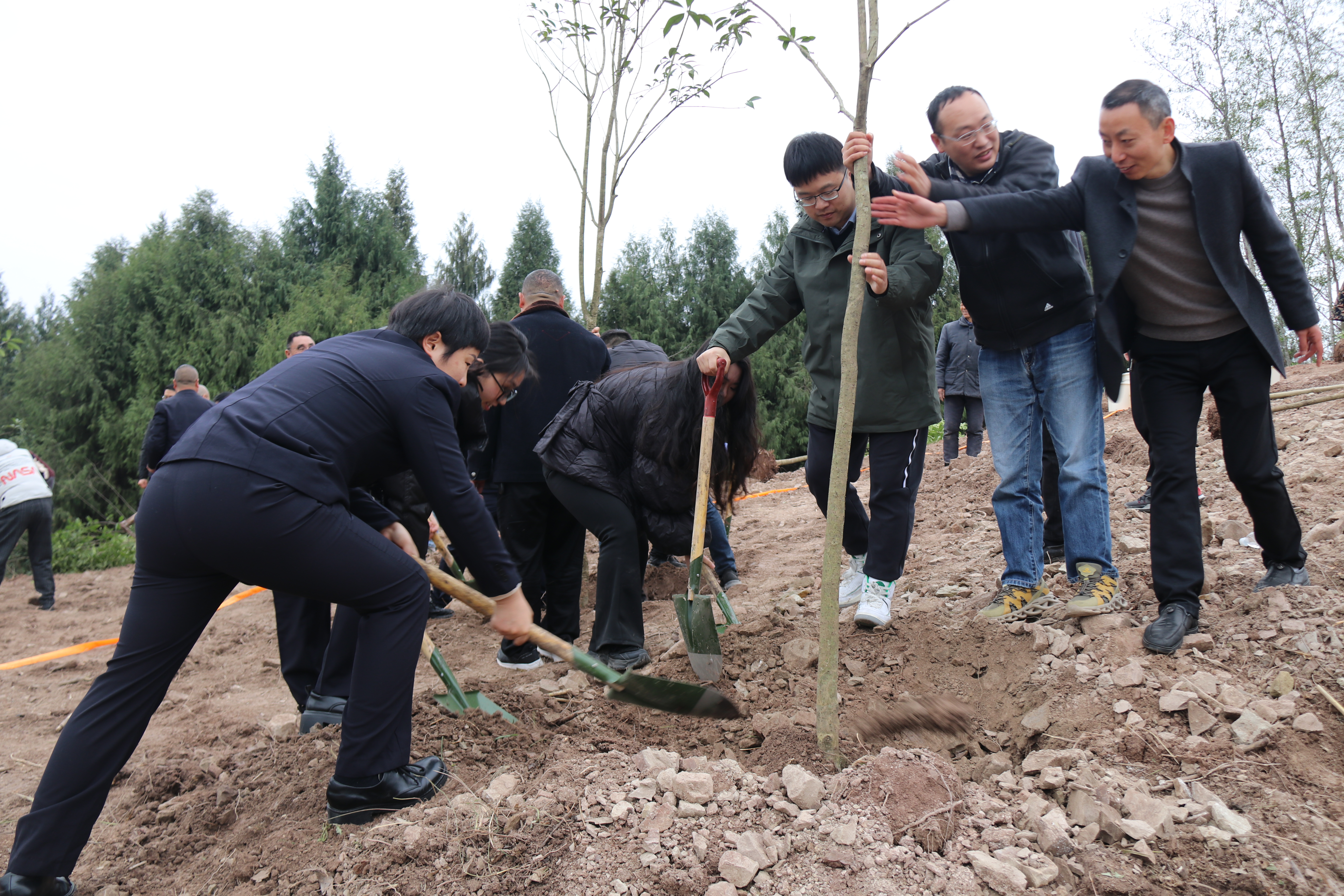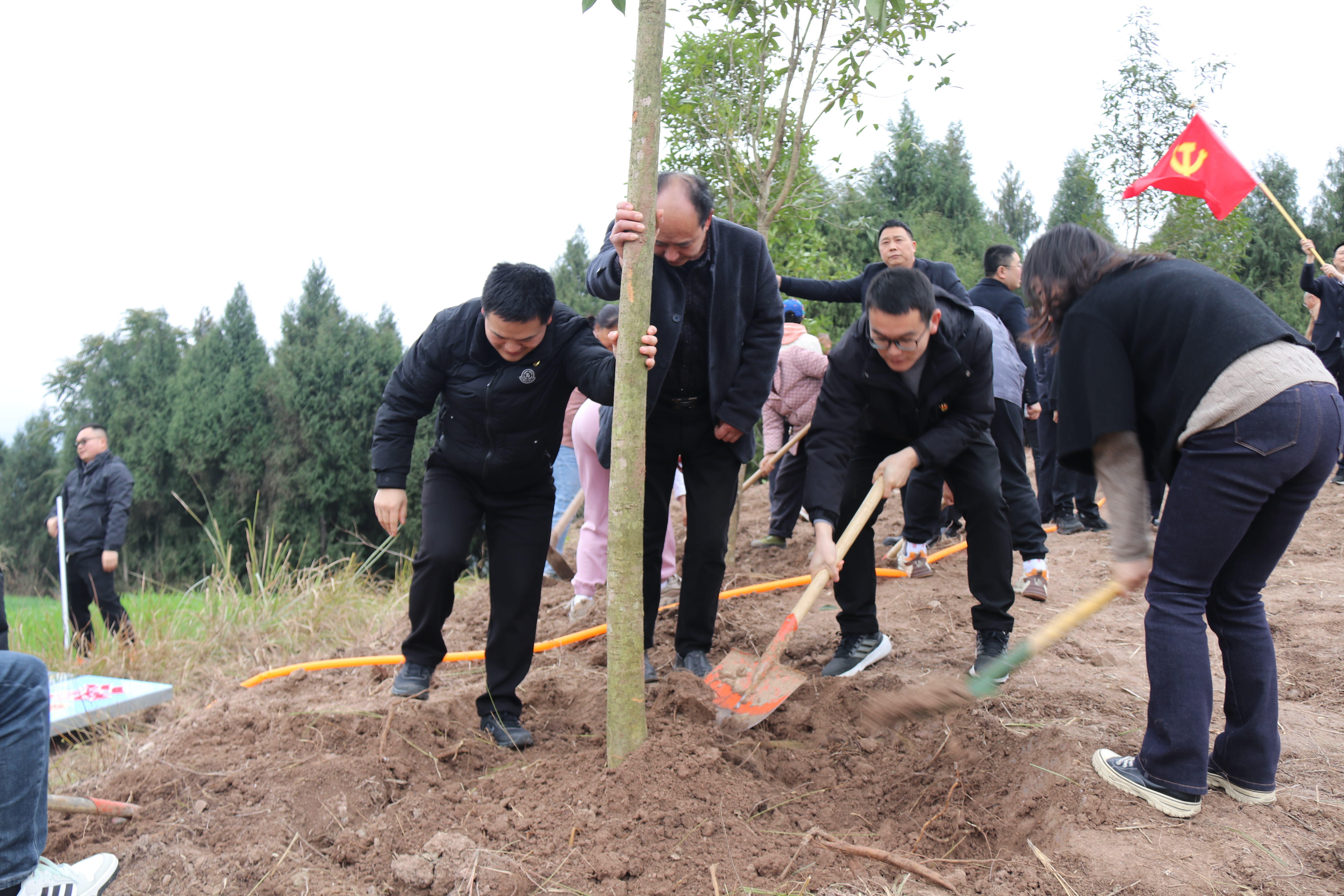 随后,党员干警来到植树现场,大家纷纷领取植树工具,他们有的挥锹铲土,有的扶苗填坑,有的提水浇灌,分工明确,配合默契,脸上洋溢着喜悦和自豪。在和煦的春风中,新栽种的树苗错落有致、昂首挺立,“德乡”检察林落地生根,展现出勃勃生机。